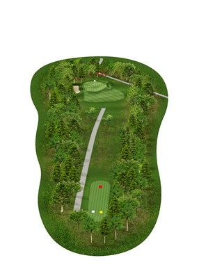 De start van de backnine begint met deze uitdagende par-3. Om problemen aan de linkerkant te voorkomen is rechts- middengreen een mooi target. Let goed op de windrichting; je clubkeuze kan hierbij een grote rol spelen! Het raken van de (voor)green is hier altijd een goed schot!